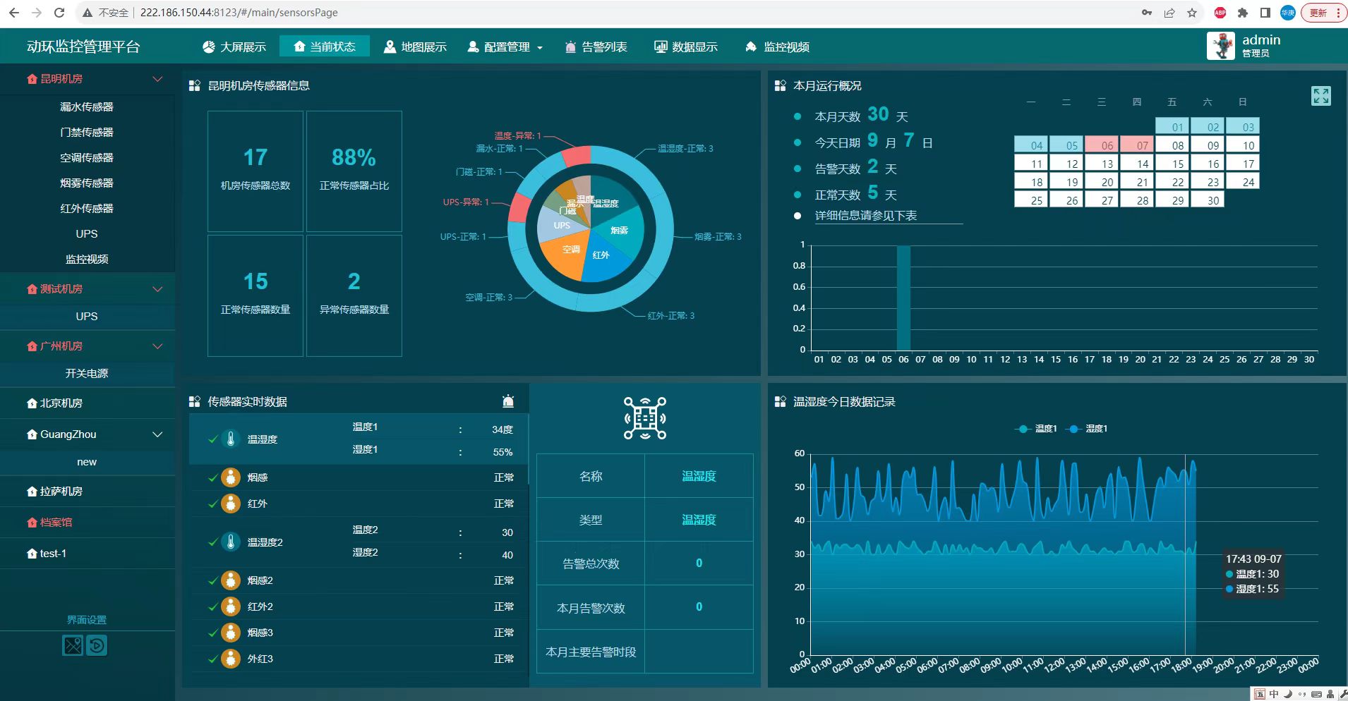 在环境监控中,如温湿度监测,采用RS485数字传感器,每20㎡部署1个监测点,支持自定义温湿度上下限阈值及历史曲线查询。而通过漏水感应绳,当发生漏水时感应绳将报警信号传给定位式测漏控制模块 (区域式漏水控制模块),通过定位式测漏控制模块提供的RS485智能接口及通讯协议,采用总线的方式将漏水报警信号直接接入监控主机的串口,由监控平台软件进行漏水的实时监测。